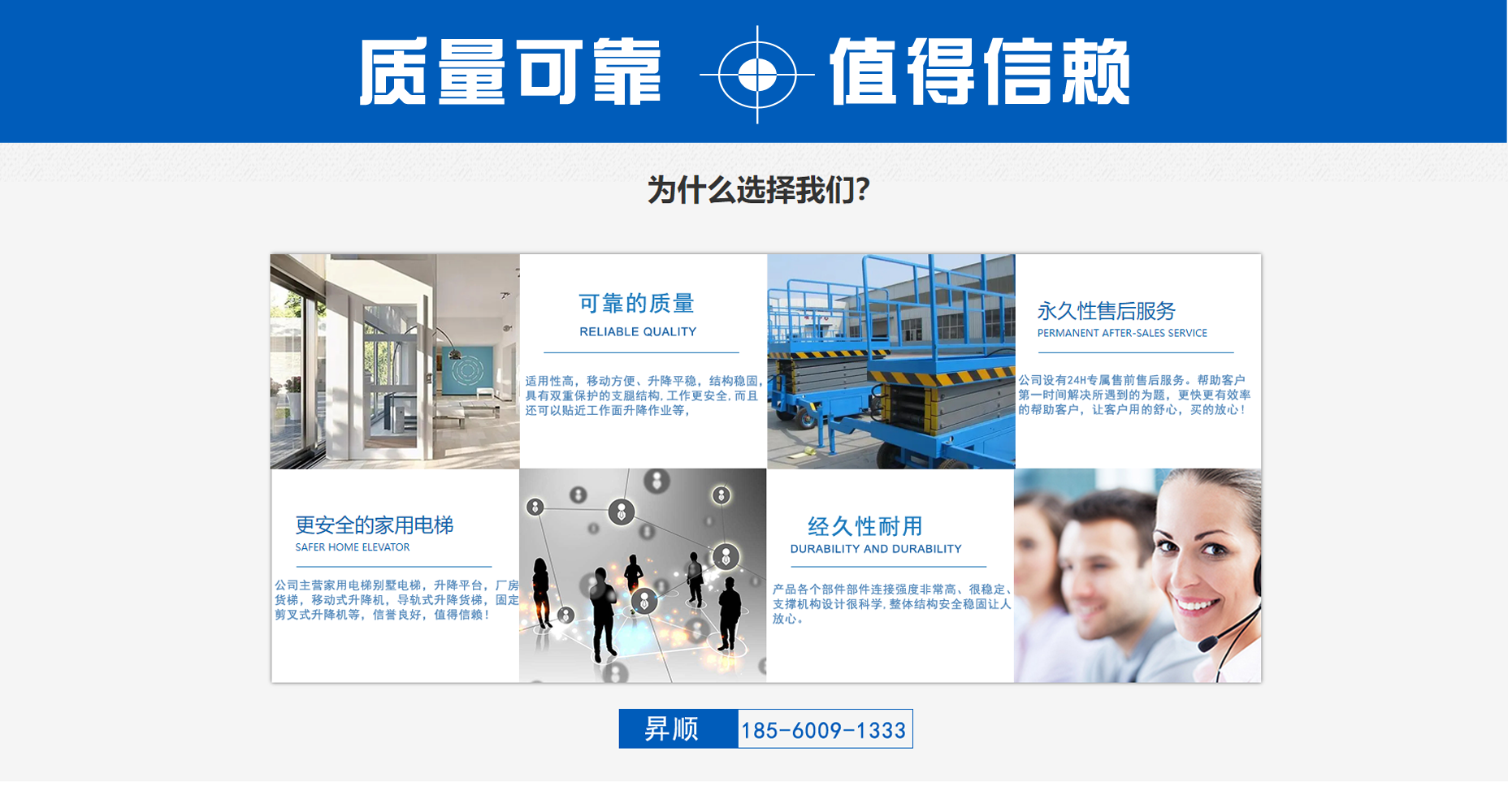 山東昇順液壓升降機械有限公司是一家主營家用電梯,別墅電梯,升降平臺,廠房貨梯,移動式升降機,導軌式升降貨梯,固定剪叉式升降機等產品企業,質量可靠,值得信賴。 用戶至上,以用戶為中心”是公司永遠堅持的服務宗旨,贏得用戶的贊許是我們的榮譽,及時滿足用戶的需求,是我們公司的愿望。長期以來,公司員工以優(yōu)質的服務,取悅于用戶,以誠信的言行取信于用戶,得到了用戶們的好評。我們期待著與您更加愉快的合作!公司的發(fā)展,離不開社會的大力支持,在社會的支持和幫助下,我們正昂首闊步邁向未來! 我們的經營方針是:以質量求生存,以產品求發(fā)展,以信譽保合作,以服務贏客戶。 本公司對產品質量和各項服務恪守合同承諾,并愿與新老客戶精誠合作,共創未來。 公司精神:創新是主題,超越是不懈的追求。 公司宗旨:信譽保證,誠信為本。 我們會以合理的價格,良好的信譽,雄厚的實力,優(yōu)質的產品,最周到的服務,服務于廣大新老客戶!...